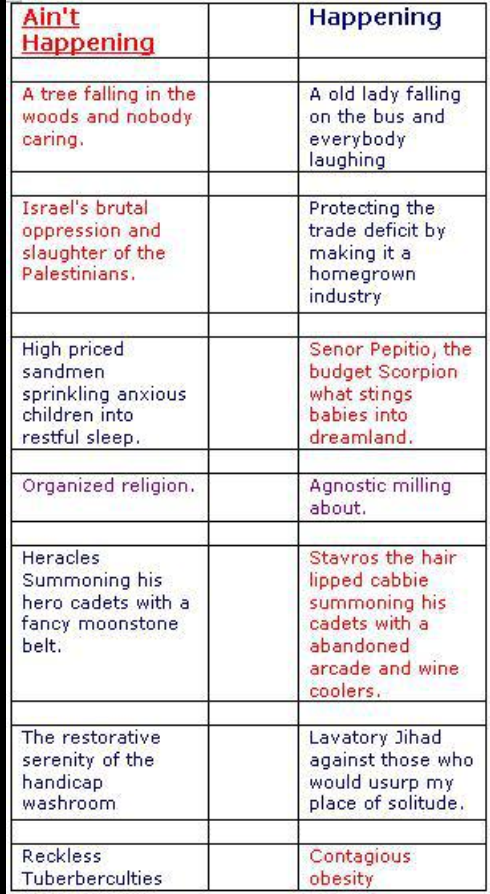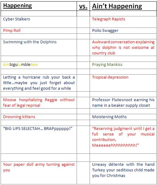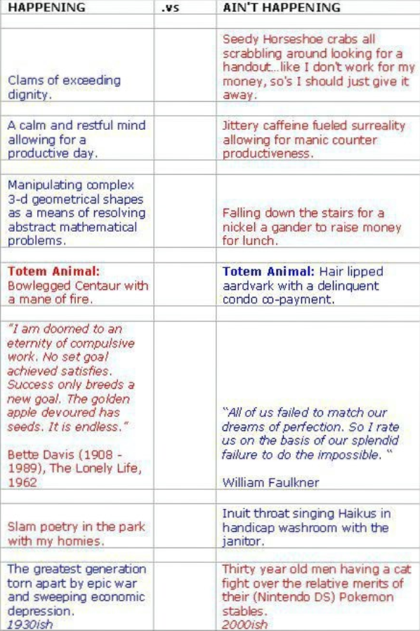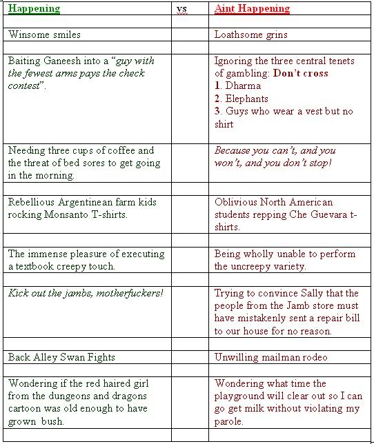 The only thing worse than a nostalgic narcissist is a nostalgic narcissist with internet access and a back catalogue. Of all the features from the old site this was the hardest to explain in person. Essentially it was a list of things that I considered Happening juxtaposed by a tangentially related thing that was Not Happening. Of everything I wrote these were the surrealist and most reflective of my personal sense of humor. Taste may vary.
