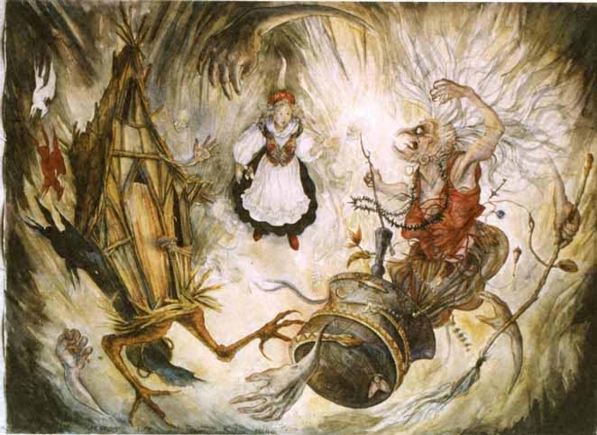 Baba Yaga, purloiner of children, devourer of men, the iron toothed witch that stalked the forests of pre Czarist Russia with the brutality of a slavic nightmare and the absurdity of a Monty Python animated short. Generations of careless children and foolish men wandered into the demonic crones clutches, driven into the woods by the promise of delicious pine sap and a reprieve from long depressing stories that go nowhere. No riddle, secret name, or act of kindness would stay her predation, her only game was hunger….and to play was to die.